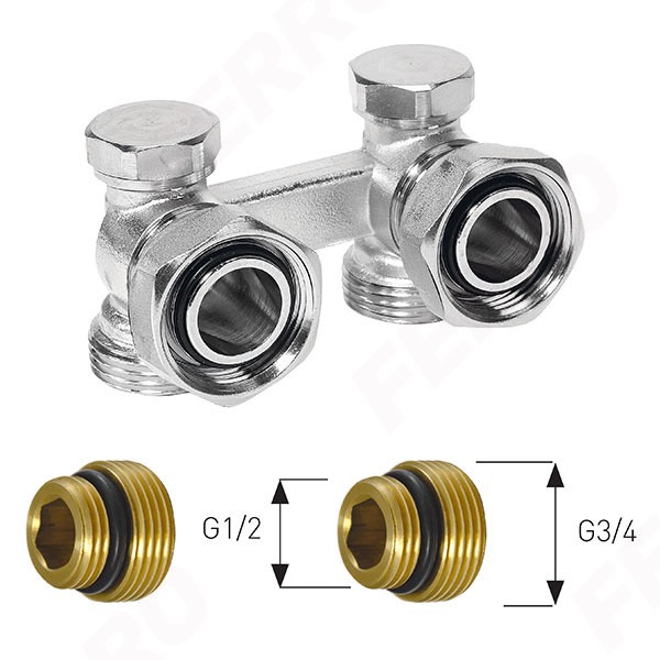 Кран радиаторный угловой Ferro LZ07YK интегрированный с двумя муфтами нр ½”-нр ¾”.