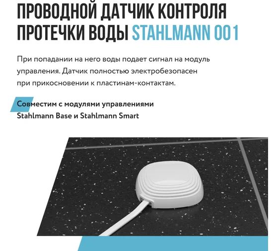 Проводной датчик контроля протечки, при попадании на него воды подает сигнал на модуль управления. Является электробезопасным при прикосновении к пластинам-контактам. Совместим с модулями управлениями Stahlmann Base и Stahlmann Smart.