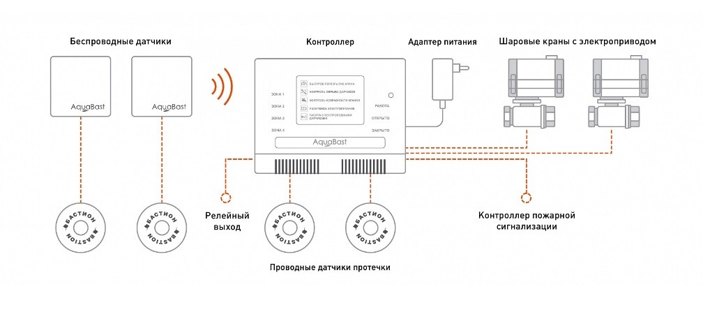 Комплект защиты от протечек воды Бастион AquaBast Line Квартира 3/4", управление одной кнопкой, светодиодная индикация режимов работы и зон протечки энергосберегающий режим при работе от АКБ, звуковое и световое оповещение о протечке и авариях периферийных устройств.
