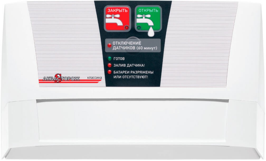 Контроллер «Аквасторож Классика» АК01 - это управляющий модуль всей системой защиты от протечек воды, предназначенный для информирования пользователя звуковой сигнализацией и/или светодиодной индикацией о заливе водой датчиков протечки и минимизации пользователем последствий потопа при помощи сигнала на закрытие кранов. Через контроллер настраивается и управляется вся система защиты от потопа, подключаются краны, проводные и беспроводные датчики, а также дополнительные компоненты, такие как проводная или беспроводная кнопка, радиобаза для беспроводной работы, батарейные блоки и блок питания, силовой расширитель и прочее.