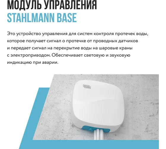 Модуль управления Stahlmann Base - это устройство управления для систем контроля протечек воды Stahlmann. Модуль совместим с проводными датчиками контроля протечки воды Stahlmann 001 и оснащен световым и звуковым оповещением при аварии.