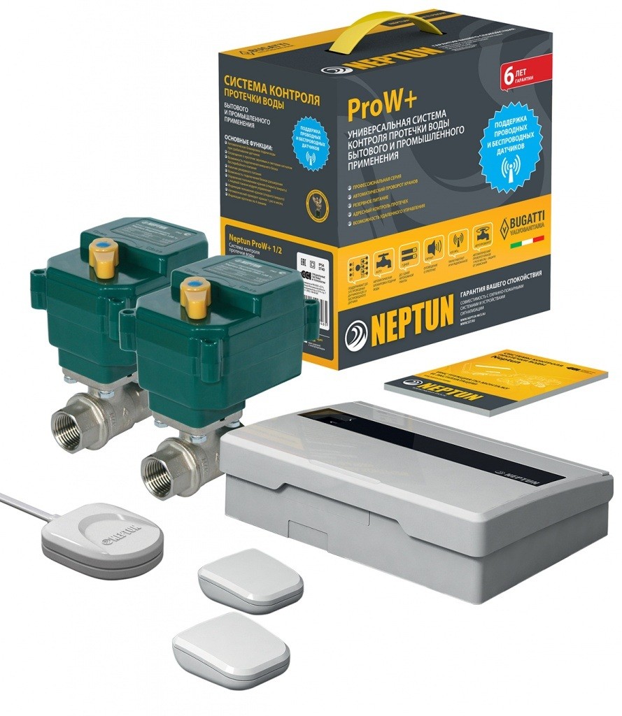 Система контроля протечки воды Neptun ProW+ предназначена для свое временного обнаружения и локализации протечек воды в системах водоснабжения и отопления. Система заблокирует подачу воды до устранения причин аварии и проинформирует о возникшей аварии звуковым и световым сигналами. Особенно удобна для установки в помещениях с законченной отделкой. Система «Neptun ProW+» оснащена резервным питанием и сохраняет работоспособность при отключении электропитания в сети. «Neptun ProW+» предназначен для обработки сигналов от проводных и беспроводных датчиков контроля протечки воды.