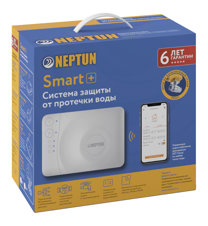 Умная система защиты от протечки воды Neptun PROFI Smart+ предназначена для обнаружения и локализации протечек воды в системах водоснабжения. Компоненты системы связаны и взаимодействуют друг с другом через центральный контроллер (модуль управления Neptun Smart+), который может быть укомплектован дополнительными платами расширения: