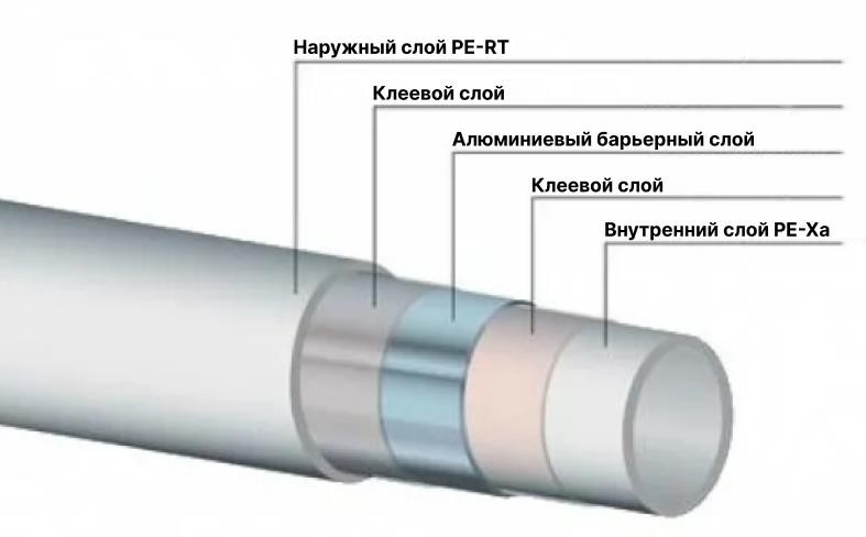 Наружный слой выполнен из полиэтилена повышенной термостойкости PE-RT, внешняя поверхность трубы PE-Xa/Al/PE-RT серого цвета.