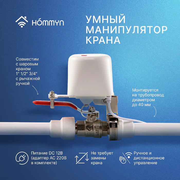 Манипулятор шарового крана электрический Hommyn WZB400W - предназначен для перекрытия кранов в системах водоснабжения.