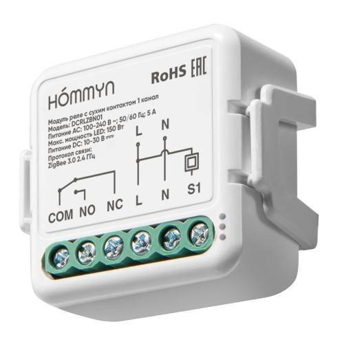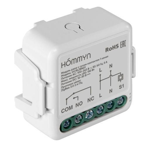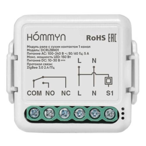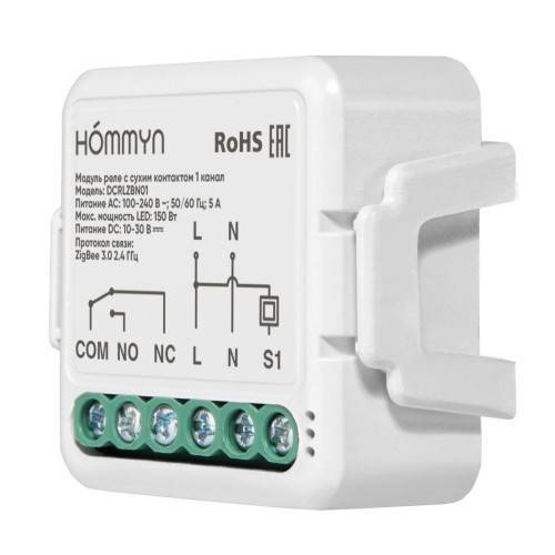 Модуль реле HOMMYN с сухим контактом 1 канал DCRLZBN01, тип связи: Zigbee, материал корпуса: ABS пластик, дальность действия сигнала: до 30 м, тип управления: дистанционное