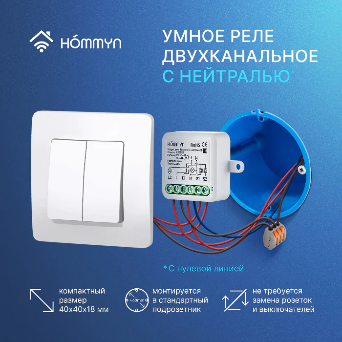 Реле Hommyn zigbee 2 канала (с нейтралью) RLZBN02 – позволяет «прокачать» ваши любимые домашние «неумные» одноклавишный выключатель или розетку, делая их умными, не меняя их оригинальные функции и внешний вид.