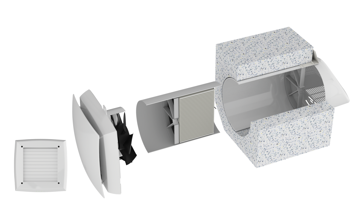 Энергоэффективная приточно-вытяжная установка состоит из плоской лицевой панели, автоматически закрывающейся решетки, наружного вентиляционного колпака, вентилятора, фильтров, телескопического воздуховода и теплообменника. Устройство монтируется в стену комнаты, которая выходит на улицу. Для того, чтобы воздух перемещался из комнаты на улицу и с улицы в комнату, в рекуператоре используется вентилятор. Вентилятор является реверсивным, то есть может подавать воздух в двух направлениях. На лицевой панели есть автоматические жалюзи, которые при выключенном вентиляторе обеспечивают плавное закрытие вентиляционного канала.