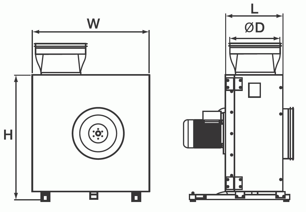 Корпус вентиляторов серии EF изготовлен из высококачественной стали с 40-мм изоляцией. Двигатель находится на откидной панели. Вентиляторы оборудованы высокоэффективной крыльчаткой с назад загнутыми лопатками. Двигатель отделен от воздушного потока, поэтому на работу вентилятора не влияют жировые загрязнения. Шариковые подшипники двигателя не требуют техобслуживания и имеют длительный срок службы. Двигатели имеют встроенный термоконтакт. Регулирование скорости вентиляторов EF осуществляется путем изменения напряжения за счет использования пятиступенчатых трансформаторов TRE или однофазных плавных регуляторов скорости SRE. К одному регулятору можно подключить несколько вентиляторов при условии, что общий ток вентиляторов не превышает номинальный ток регулятора. В двигатели вентиляторов встроены защитные термоконтакты, требующие подключения внешнего защитного термореле. В случае применения пятиступенчатых регуляторов скорости TRE дополнительное защитное термореле не нужно. На корпусе вентилятора имеется кронштейны для надежного монтажа. Возможны 3 положения патрубка. Изменение конструкции можно выполнить прямо на месте установки, переместив дверные петли. Корпус имеет специальную форму для сбора жира и слив.