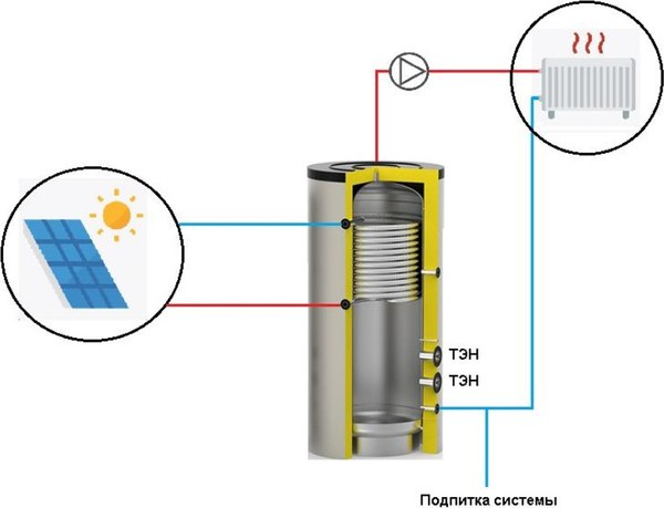 Также бак оснащен спиральным теплообменником для подключения дополнительного источника тепла, такого как газовый котел, котел на твердом топливе, солнечный коллектор, тепловой насос либо централизованная система отопления.