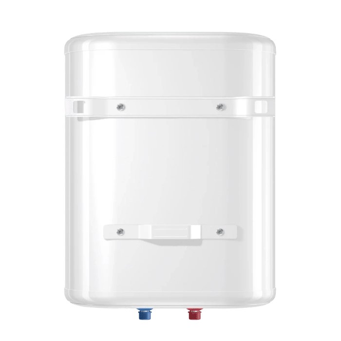 Два резьбовых патрубка служат для подключения к системе водоснабжения: с синим кольцом – для подачи холодной воды, а с красным – для выпуска горячей. Бак из нержавеющей стали, защищает внутреннюю поверхность от химической коррозии. На съемном фланце внутреннего бака смонтированы: нагревательный элемент, термостат и магниевый анод. ТЭН служит для нагрева воды, а термостат обеспечивает возможность регулировки температуры нагрева до +75°С. Магниевый анод предназначен для нейтрализации воздействия электрохимической коррозии на внутренний бак.