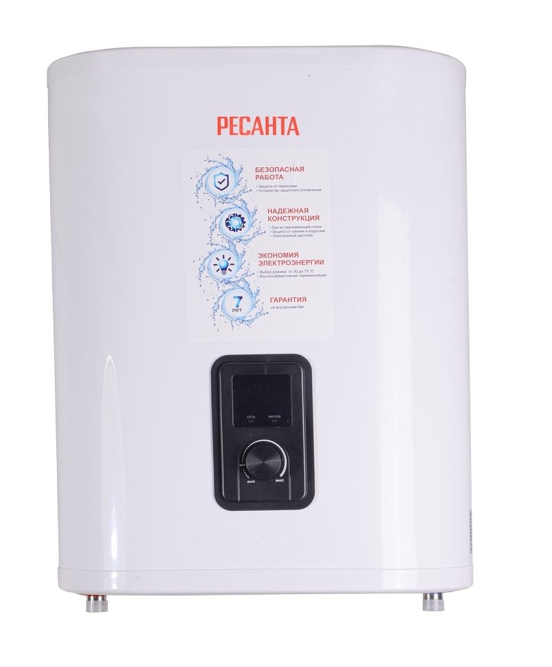 Накопительный водонагреватель Ресанта ВН-30В 74/5/1 обладает баком на 30 литров из нержавеющей стали. Данный прибор используется в квартирах, в коттеджах или на дачах. На корпусе расположен дисплей, отображающий температуру нагрева.