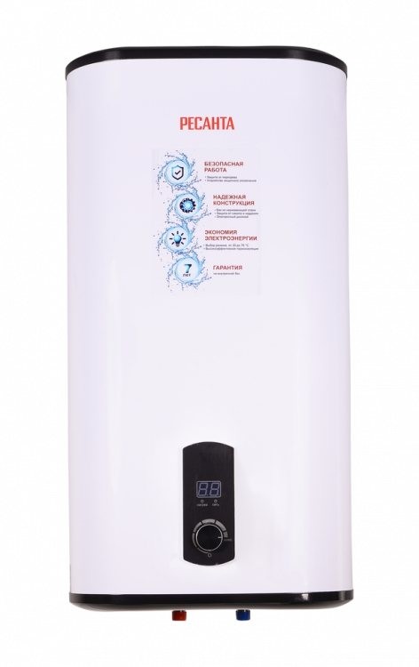 Накопительный водонагреватель Ресанта ВН-50В 74/5/2 обладает баком на 50 литров из нержавеющей стали. Данный прибор используется в квартирах, в коттеджах или на дачах. На корпусе расположен дисплей, отображающий температуру нагрева.