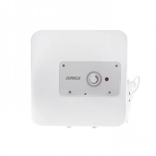 Настенный накопительный электрический водонагреватель с установкой над раковиной. Материал корпуса из пластика белого цвета, квадратной формы. Механическое управление. Водонагреватель имеет один внутренний стальной бак с покрытием из эмали. Подключение горячей и холодной воды происходит в нижней части корпуса. На лицевой стороне расположен регулятор температуры. Водонагреватель снабжен кабелем питания без УЗО длиной 1 м. Размер входа холодной и выхода горячей воды 1/2". Расстояние между входом холодной и выходом горячей воды 100 мм.