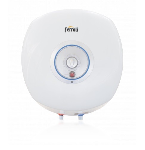 Малоразмерный округлый водонагреватель накопительного типа Ferroli Moon SN10SVE2 располагается под раковиной возле стока, нагревает воду для бытовых нужд до +75°C за 20 минут. Бак 10 литров. Мощность ТЭНа 2 кВт.