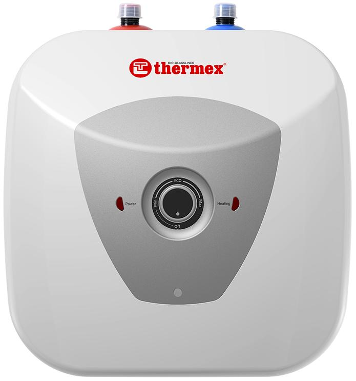 Электроводонагреватель Thermex H 10 U (pro) представляет собой емкость объемом 10 литров, состоящую из двух баков, вложенных друг в друга. Поверхность внутреннего стального бака покрыта специальным стеклофарфоровым покрытием, защищающим от коррозии и тем самым продлевающим срок службы бойлера. В эту емкость сверху вмонтированы два патрубка. Один (с синим кольцом) — для впуска холодной воды. Второй (с красным кольцом) — для выхода нагретой горячей воды. Нагрев воды внутри бака производится при помощи расположенных там трубчатых электронагревателей (ТЭНов), управляемых капиллярным термостатом.