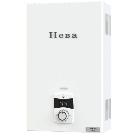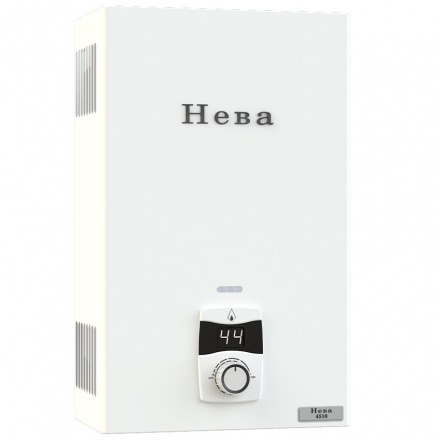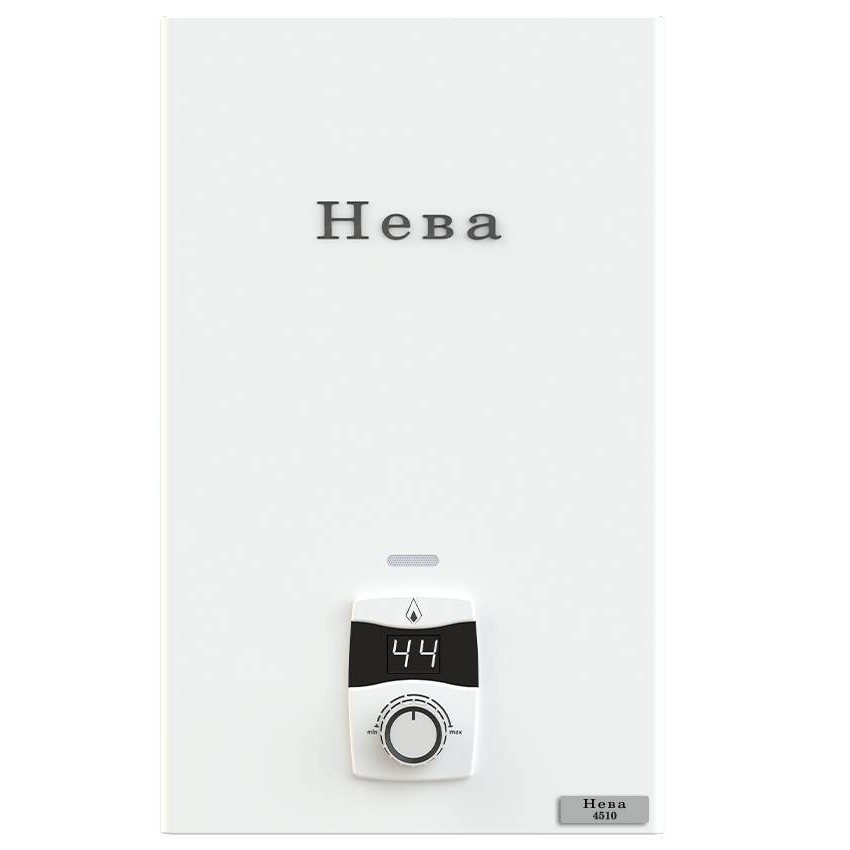 Газовая колонка Neva 4510 – мощность 20 кВт, проток воды 10 л/мин. , автоматическое зажигание, латунный водяной узел со сбросным клапаном, ЖК дисплей, регулировка температуры.