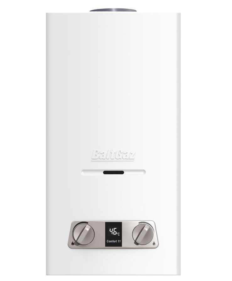 БалтГаз Комфорт 11 — газовая колонка серии Comfort, расчитанна на нагрев воды 11 литров в минуту проточным способом. Главное отличие серии наличие механической модуляции пламени, она позволяет избегать резкой перепады температуры при использовании одновременно горячей воды на кухне и ванной. Газовая колонка Нева Comfort так же имеет эффектный, современный внешний вид. На дисплее помимо темературы нагрева так же отображается уровень заряда батарей, которые используются для автоматического включения при открытии крана горячей воды.