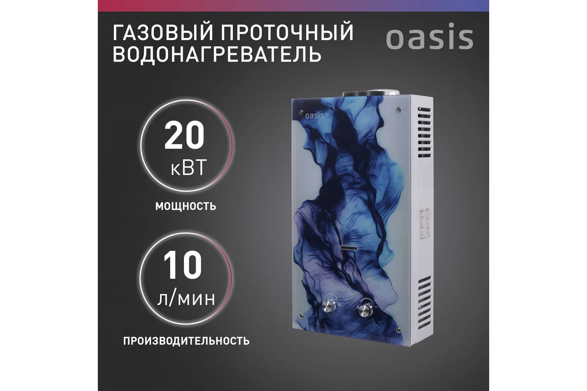 Газовый проточный водонагреватель Oasis Eco Glass D-20, крепление настенное, камера сгорания открытая, мощность 20 кВт, производительность 10 л/мин, электророзжиг
