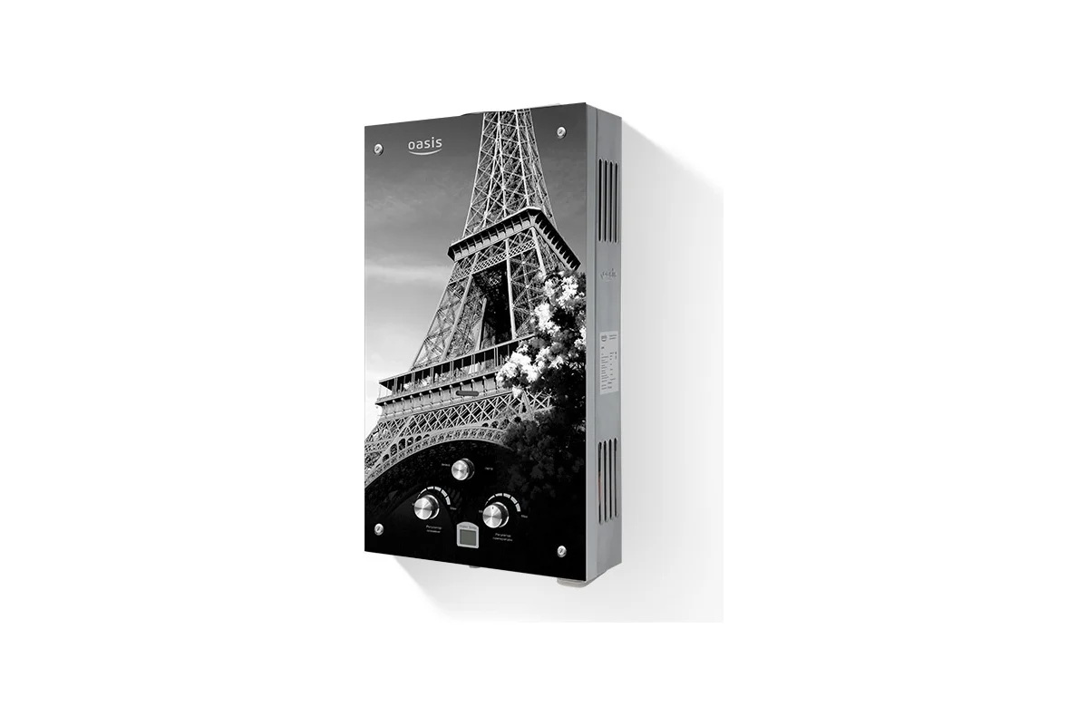 Газовый проточный водонагреватель Oasis Glass 20 EG, крепление настенное, камера сгорания открытая, мощность 20 кВт, производительность 10 л/мин, электророзжиг