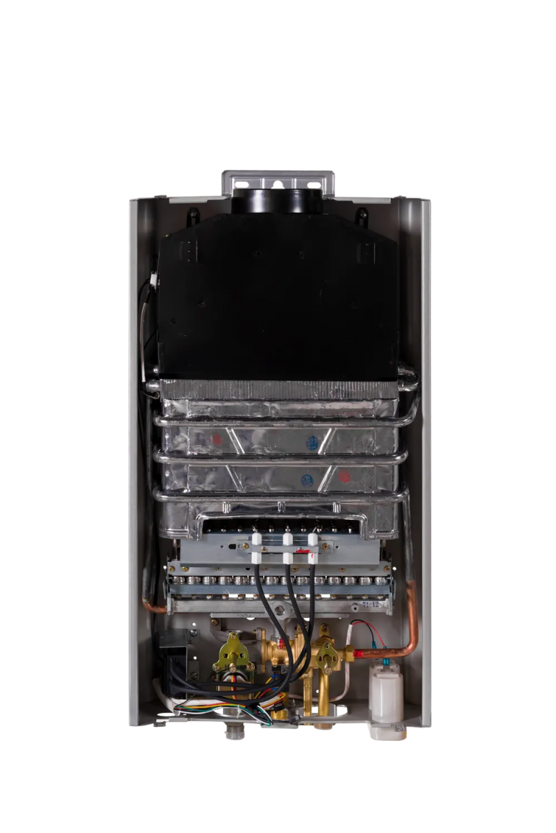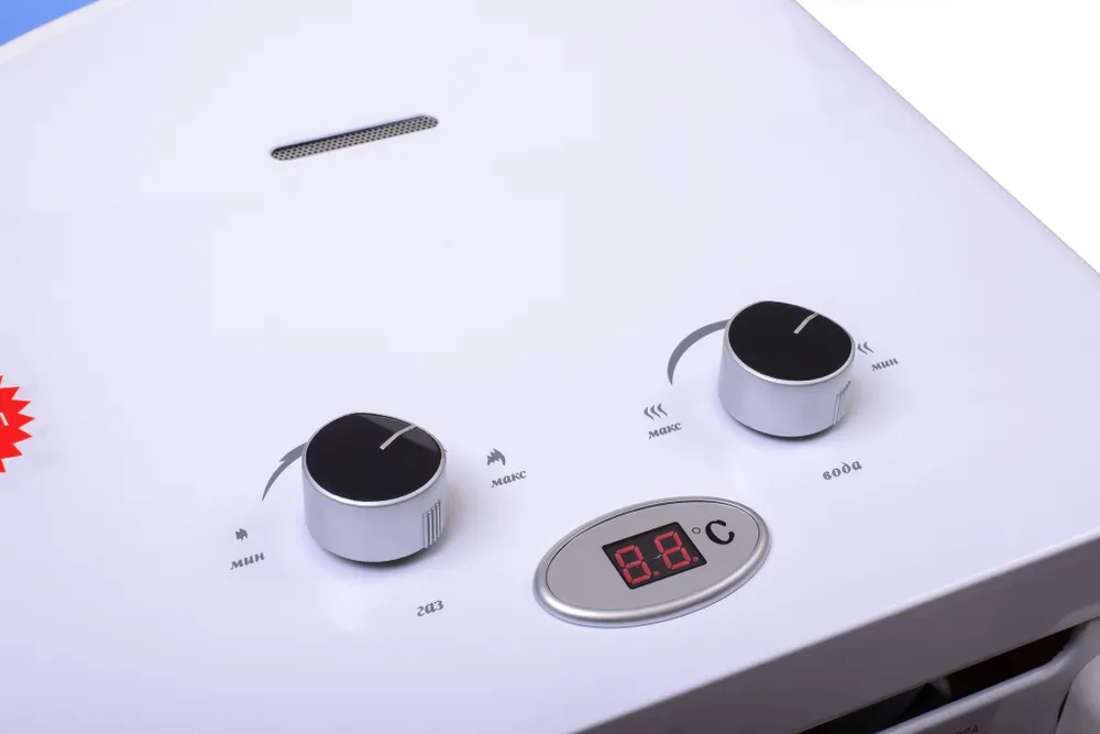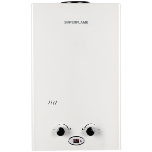 Газовый проточный водонагреватель Superflame SF0120 - мощность 20 Квт. Серия предназначена для мгновенного нагрева воды для кухни или ванной комнаты, поочередно. На лицевой стороне расположены 2 ручки управления температурой нагрева и ручка выбора мощности. Аппарат имеет несколько защит от внештатных ситуаций. Колонка имеет встроенный датчик тяги, встроенный датчик протока воды и наличие пламени газа. Кроме того на экране отображается режим работы водонагревателя, текущая температура. Прибор работает от батареек. Он автоматически начинает работать при открытии крана с водой и полностью гаснет при его закрытии.
