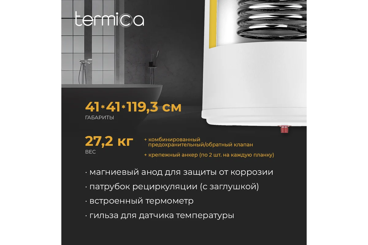 Бойлер косвенного нагрева TERMICA AMET W INOX на 120 л предназначен для приготовления горячей воды с использованием отопительного котла в качестве основного источника нагрева. Бак из нержавеющей стали AISI 304 обладает высокой степенью защиты от коррозии. Спиралевидный теплообменник, выполненный из нержавеющей стали AISI 316L, с большой площадью поверхности обеспечивает быстрый и равномерный нагрев ёмкости.