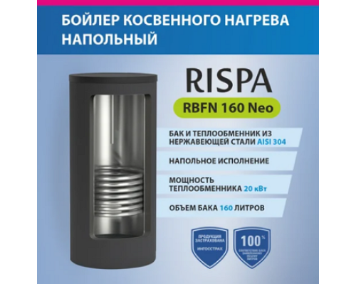 Бойлер RBFN NEO 160 напольный (нерж. сталь 304) RISPA, косвенный нагрев, напольный, объем 160 л, мощность 20 кВт, заднее подключение, возможность подключения ТЭНа