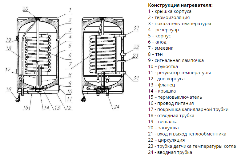 Водонагреватель нагревает воду за счет мощности работающего отопительного котла. В периоды, когда работа отопительного котла нецелесообразна, нагрев воды осуществляется установленным в водонагревателе ТЭНом. Водонагреватель оснащен высокоэффективной теплоизоляцией, что позволяет снизить теплопотери. Защита от коррозии обеспечивается специальным термостойким покрытием внутреннего резервуара и магниевым анодом увеличенного сечения.