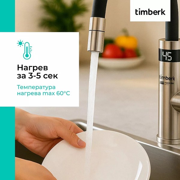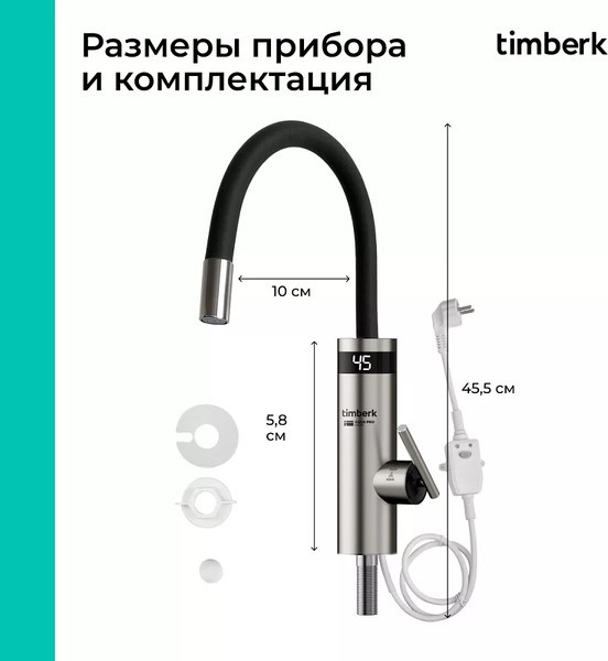 Проточный водонагреватель Timberk Aqua Pro T-IT3-MD-R12 — с устройством защитного отключения, устанавливается на мойку или столешницу. Стандартный европейский разъем VDE EU Plug, удобная длина шнура 1.1 м обеспечивают простой монтаж. Водонагреватель включается автоматически при открытии крана и мгновенно нагревает воду. Температура воды отражается на дисплее. Корпус из нержавеющей стали не подвержден коррозии и трещинам и протечкам. Проточный водонагреватель обеспечит вас горячей водой в любое время года, на даче или в квартире. Мощность 3.6 кВт. В комплекте УЗО (устройство защитного отключение).