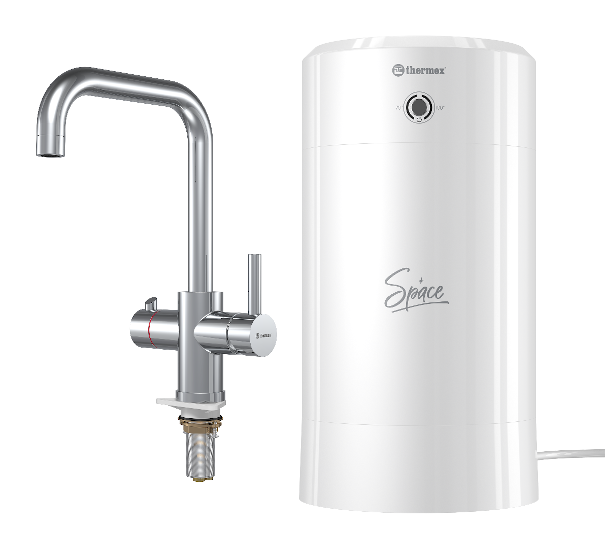 Электрическая система кипячения воды Thermex Space компактна и функциональна, она встраивается в систему водоснабжения и обеспечивает бесперебойный нагрев воды и как водонагреватель, и как чайник. Внутренний бак позволяет держать под рукой предварительно нагретыми до 6 литров кипятка, а встраиваемый смеситель будет отлично смотреться на любой кухне. Thermex Space – это универсальное устройство, которое выполняет функции малолитражного водонагревателя, чайника и смесителя. Подходит для мгновенного заваривания чая, варки макарон, стерилизации бутылочек и прочего, на что хватить вашей кулинарной фантазии. Один прибор выполняет сразу три функции, занимая меньше места и потребляя меньше электричества. Производит меньше шума, чем стандартный чайник, и предоставляет 6 литров готового кипятка, как термопот.