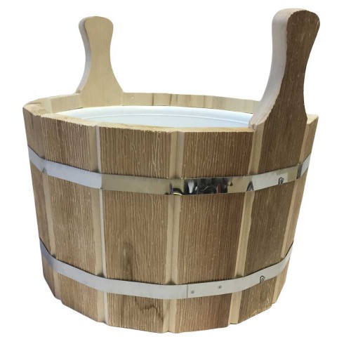 Шайка 8л с пластиковой вкладкой (ПЛ-12) с тиснением "Под старину" - сделана из натурального дерева и предназначена для использования в бане. Пластиковая вставка продлит срок службы изделия. Оригинальный орнамент изделия выгодно выделяет Ваш аксессуар из общей линейки.