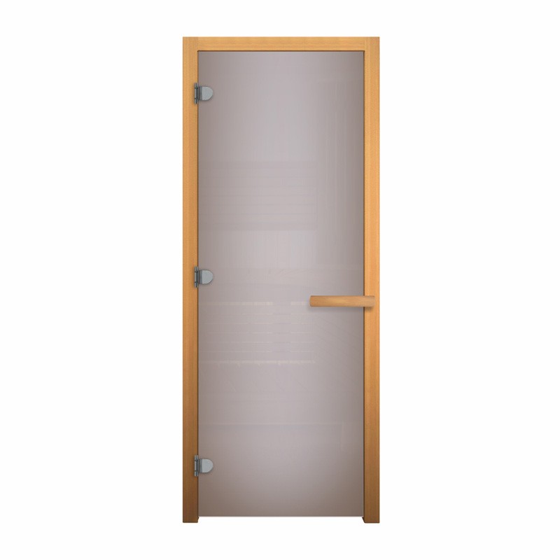 Стеклянная дверь для бани сатин матовая – используется для установки в помещениях бани. Изготавливается из 8-ми мм каленого стекла, что делает ее максимально безопасной. Стеклянное полотно крепится к коробке с помощью 3-х петель. По периметру коробки установлен резиновый уплотнитель. Дверная коробка изготавливается из осины. Защелка магнитная. Дверь может открываться как влево, так и вправо.