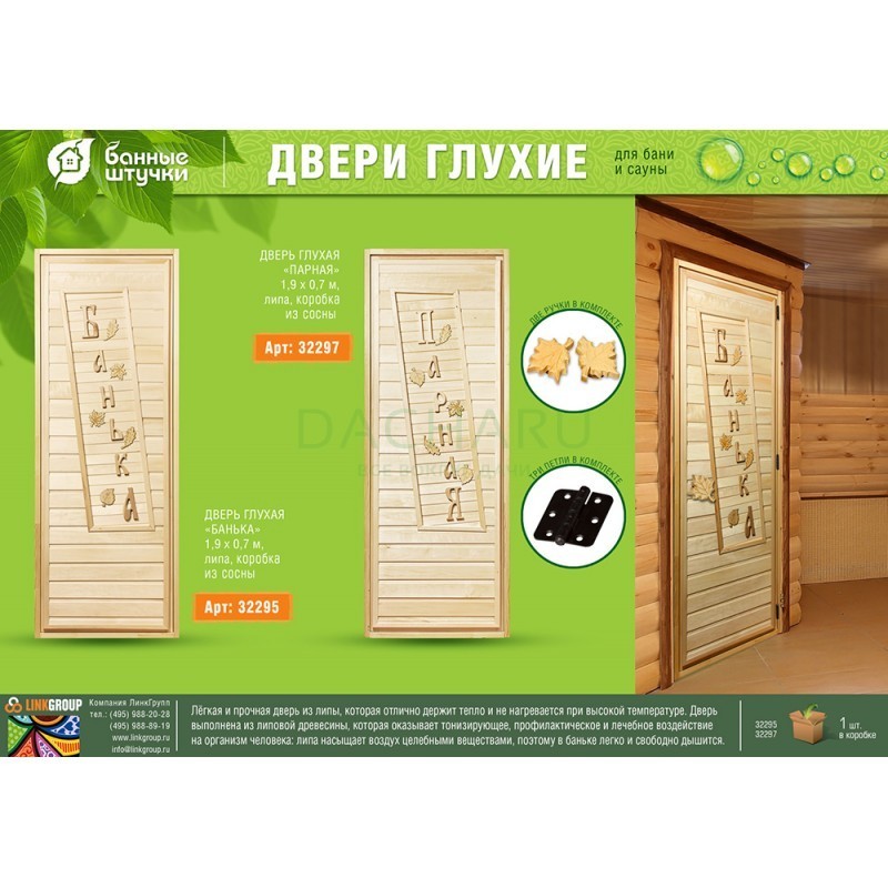 Дверь глухая «Банька» 1,9х0,7 м, липа Класс А, коробка из сосны, с ручками и петлями в гофрокоробе