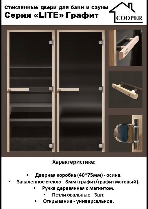 Дверь стеклянная для бани Cooper LITE 1900х700 Графит матовый (коробка осина) с прямоугольной ручкой на магнитной защелке, крепится горизонтально. Дверь универсальная: может быть как правосторонней, так и левосторонней. Наличников в комплекте нет.