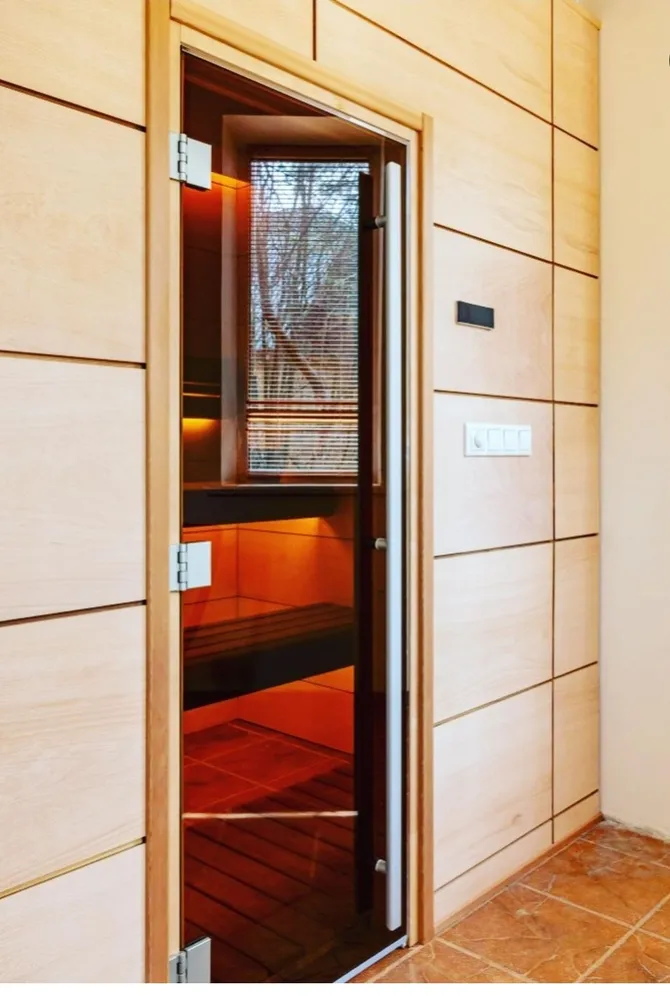 Дверь для бани Doorwood Престиж Бронза 2000x700 мм для установки в помещениях бани. Полотно: закаленное стекло (8мм) Ручка: Аллюминий (снаружи) / Дерево (внутри) Петли: 3 усиленных квадратных из аллюминия с накладками из нерж. стали. Петли расположены слева