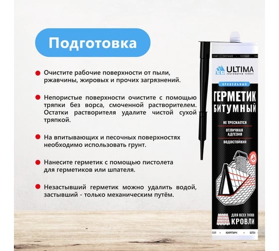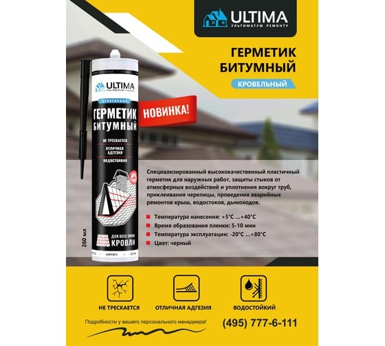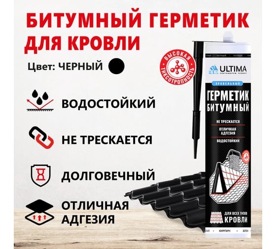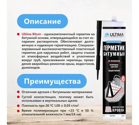 ULTIMA Bitum – это однокомпонентный битумный герметик, предназначенный для профессионального и бытового применения в сфере гидроизоляции и ремонта кровли. Благодаря своей пластичности и отличной адгезии, он идеально подходит для герметизации стыков, приклеивания черепицы, ремонта водостоков, дымоходов и других кровельных элементов. Герметик устойчив к атмосферным воздействиям, включая влагу, ультрафиолет и перепады температур, обеспечивая долговечную защиту конструкций.